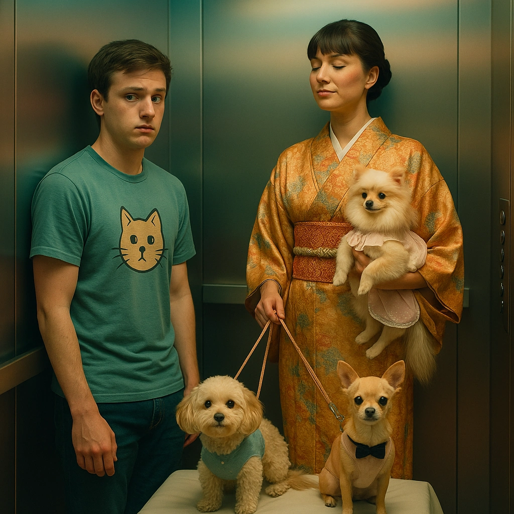 Years ago, I ran into a Japanese woman in a hospital elevator. She had a bunch of little dogs with her—maybe visiting a relative; I couldn’t tell. All I knew was that seeing that many dogs made me uneasy. Good thing I was wearing long pants.