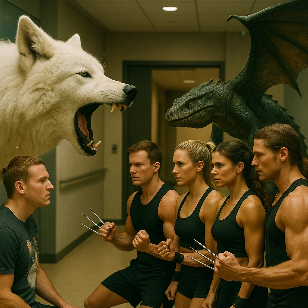 Mrs. Kokoro Superior transformed into a white wolf. Her Four Dog Guardians extended claws like Wolverine’s.