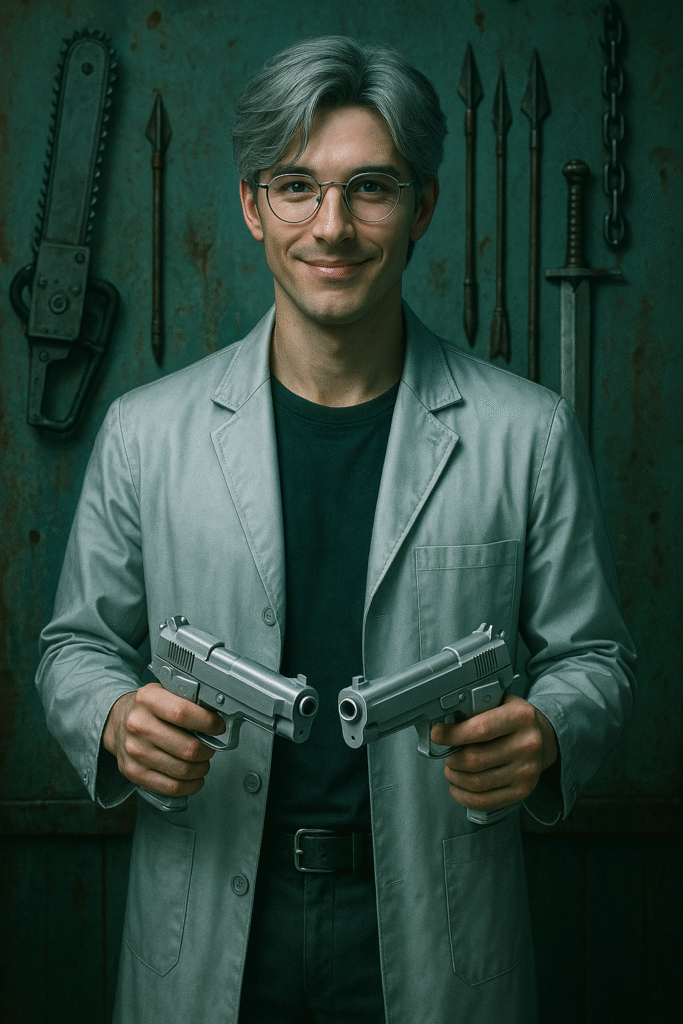 I: Whoa — are those guns made of titanium? They look like they have noble bloodlines. The director in Smoke City used white guns, and his bullets were made with three kinds of chakra. He sold me a ton of medicine; later I threw all the oral meds away.