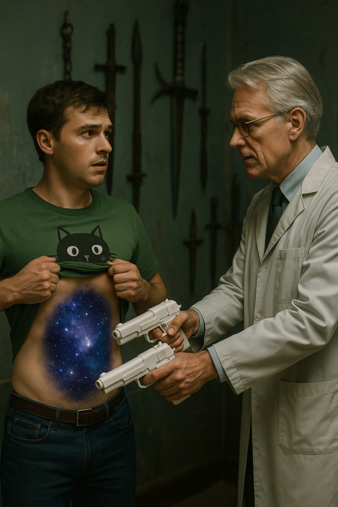 Dr. Warm: You young people don’t get it. The first time we must activate the Cosmo so your body connects with natural energy. Our method is all-natural — no drugs, no blood draws. Watch: the particles produced by these two guns are yin and yang to each other. When they reach your tissues and collide, the energy produced promotes cell repair and regeneration. These two guns must be used at the same time, with equal intensity, so your body can remain stable in this universe. If the deviation is too great, your tissue will disappear from this universe. Untrained people easily hold the two guns in the opposite hands.